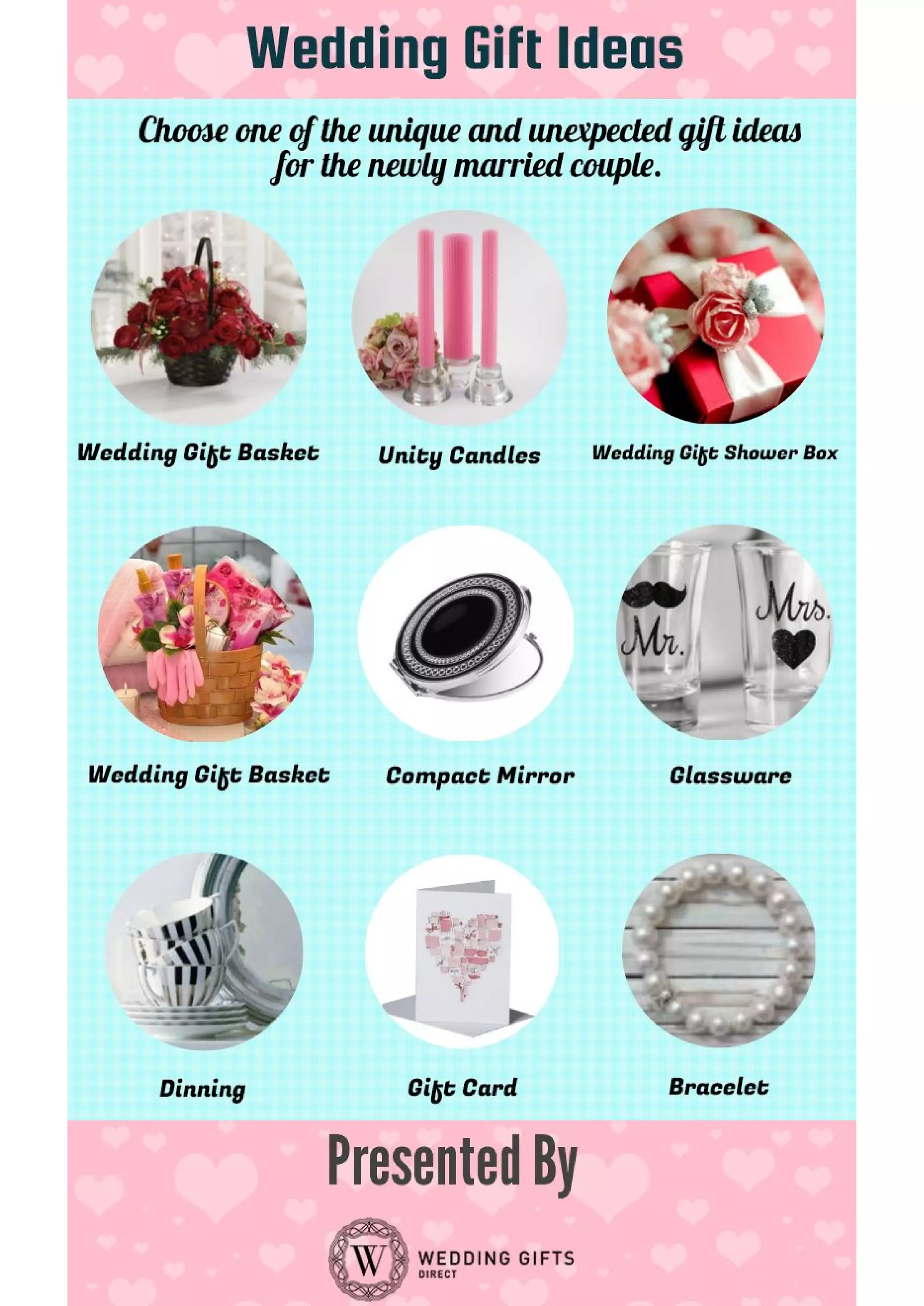 Choosing a wedding gift involves a romantic bent of mind. There are numerous wedding gifts which could be gifted to a newly wed couple. This infographic offers some important wedding gifts ideas.