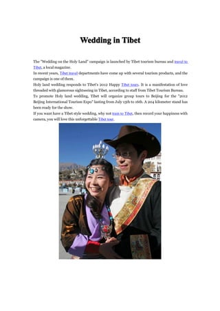 The 'Wedding on the Holy Land' campaign, launched by the Tibet Tourism Bureau and a local magazine, promotes tourism in Tibet through special wedding packages. This initiative complements the 'Happy Tibet Tours' introduced in 2012 and aims to merge the experience of love with stunning sightseeing. To further promote this campaign, group tours to Beijing for the '2012 Beijing International Tourism Expo' are being organized.