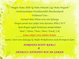 Majlis perkahwinan Norehan binti Ramli dan Shamsul Effendy bin Ab Samad akan diadakan pada Sabtu, 27 Februari 2010, di rumah keluarga di Ipoh, Perak. Undangan dibuka kepada semua sahabat, rakan, dan keluarga, dan acara tersebut akan berlangsung dari 11.00 pagi hingga 4.00 petang. Kehadiran para tetamu diharapkan dapat memeriahkan majlis dan diberkati oleh Allah SWT.