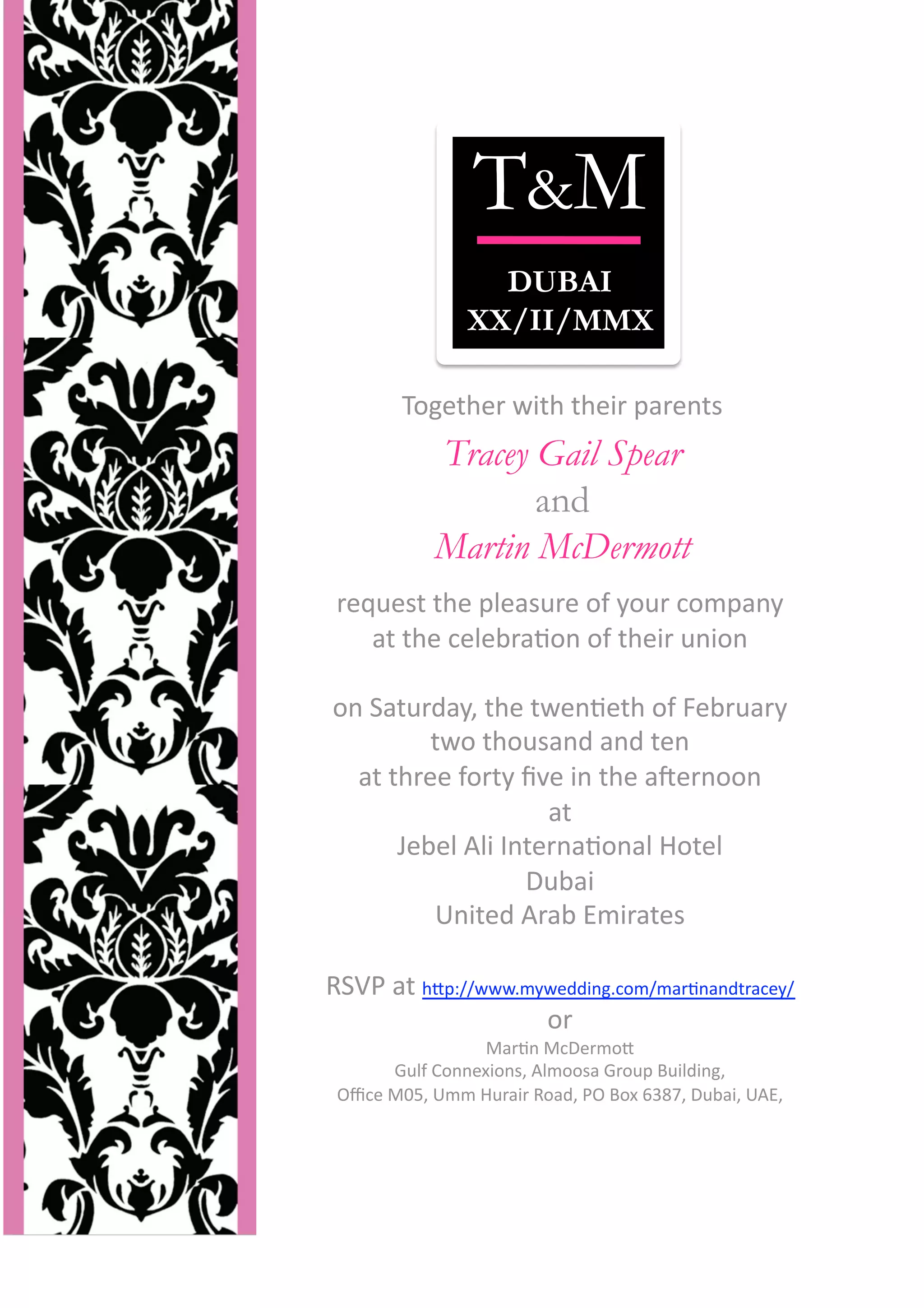 Tracey Gail Spear and Martin McDermott invite you to celebrate their wedding on February 20, 2010 at 3:45pm at the Jebel Ali International Hotel in Dubai, United Arab Emirates. RSVPs can be sent online or to Martin McDermott at his Gulf Connexions office in Dubai.