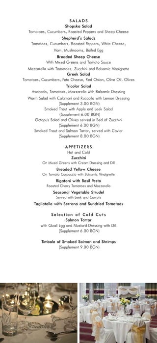 The Holiday Inn Sofia offers various wedding packages ranging from a silver menu at 50.00 BGN to a platinum menu at 67.00 BGN, including complimentary items such as a wedding menu tasting and decoration. Additional menu options feature a selection of salads, appetizers, main courses, and desserts, with extra charges for specific items. Wedding accommodations for guests are available at a discounted rate, and potential clients can reach out to the events team for more details.