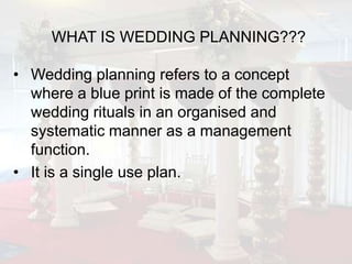 Wedding planning refers to systematically organizing all aspects of a wedding ceremony. Key factors to consider include location, attire, theme, guest list, traditions, menu, and gifts. The planning process involves creating a budget, checklist, guest list, booking vendors, decorations, transportation, and backup plans. Benefits of planning include providing guidelines, allocating resources efficiently, establishing teamwork, anticipating problems, reducing uncertainties, and facilitating coordination.