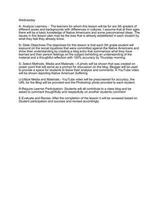 This lesson plan aims to teach 5th grade students about the social injustices committed against Native Americans. The students will come from various backgrounds and may have preexisting biases. The objectives are for students to understand the injustices by creating a blog entry summarizing what they learned and reflecting on their feelings, with 100% accuracy. To achieve this, a photo prompt, YouTube video, and class blog will be used. The teacher will screen materials beforehand and provide blog access. Students must respectfully comment on each other's posts. Afterwards, the lesson will be evaluated and revised based on student participation and success.