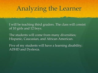 The teacher will have 22 third grade students from diverse backgrounds working on projects related to a story about the first Thanksgiving. The students will listen to a podcast of the story, work in pairs using computers and materials to develop their projects, and give each other feedback. The teacher expects 95% of students will complete the task and will check in with pairs to help as needed and ensure students understand the story.