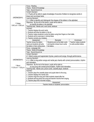 The document provides details of two English lessons for pupils. The first lesson focuses on identifying letters in the alphabet. Students will draw letters in the air, write them using their fingers, and do exercises to practice. The teacher will correct any mistakes. For assessment, students will write letters shown by the teacher. The second lesson focuses on singing songs with correct pronunciation, rhythm, and intonation. Students will listen to a song on cassette, sing it with the teacher, and have their singing recorded. The teacher will assess students' pronunciation.