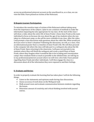 The teacher will educate 5th grade students on the Holocaust. Students will watch a video about Anne Frank, view an informational poster about her life, complete a webquest, and view links on Pinterest about Anne Frank and other victims. The teacher will use class discussions, a webquest, journaling, and Pinterest to engage students and ensure they understand how those targeted during the Holocaust were treated. She will evaluate students' learning through class discussions, assessing the accuracy of their webquest work, observing their conversations, and determining the creativity and critical thinking in their journal entries.
