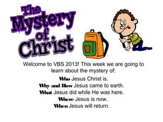 The document contains information about the schedule of services and Bible study classes at the Windsor Church of Christ on Sundays and Wednesdays. It also includes materials from a Vacation Bible School about mysteries related to the life of Jesus Christ, including when he will return, who he is, why and how he came to earth, what he did while here, and where he is now. Trivia questions, memory verses, and humor are included to engage students.