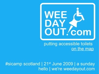 The document discusses the launch of weedayout.com, an initiative aimed at mapping accessible toilet facilities in Scotland to improve the quality of life for individuals with disabilities. It emphasizes the importance of accessible toilets in maintaining dignity and freedom for those affected, highlighting a significant gap in current public facilities. The project aims to gather data, collaborate with local authorities, and enhance community support to promote awareness and accessibility of such resources.