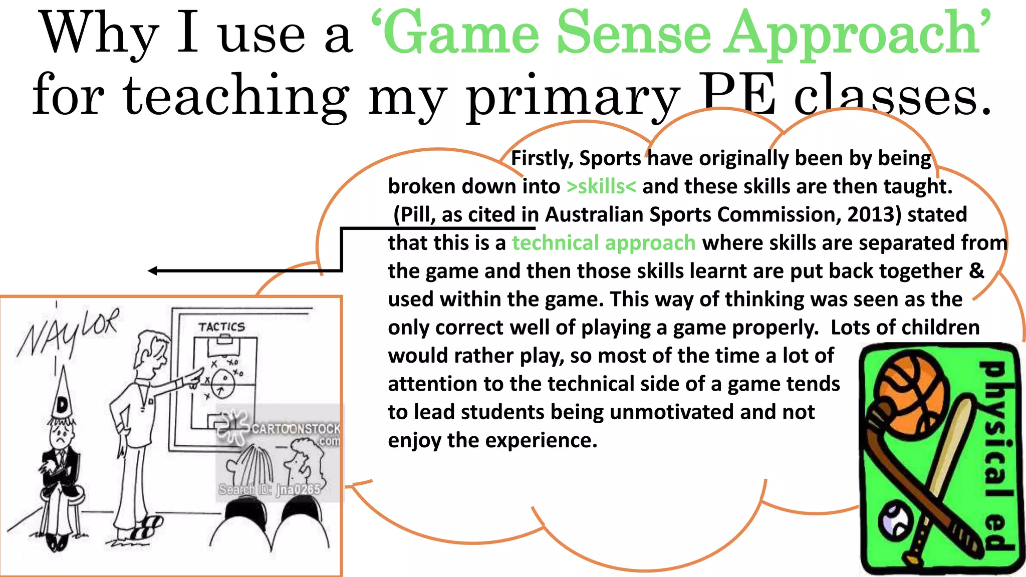 The document discusses the "Game Sense Approach" used by the author for teaching primary PE classes. This approach emphasizes play and decision-making over isolated skill drills. It places students in challenging environments where they must make tactical decisions, solve problems, and develop skills throughout lessons. This keeps students engaged and motivated compared to a technical focus on skills separated from game play. The author explains how they structure lessons using an initial game, setting challenges, practice tasks, and game progression. Research shows this approach enhances cognitive development compared to traditional skill-based coaching.