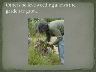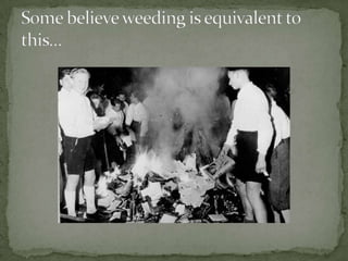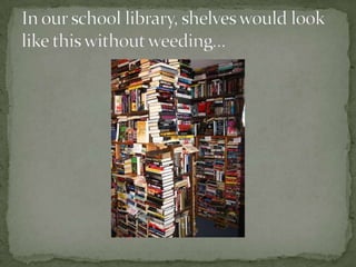 Weeding the collection allows librarians to evaluate what materials they have, remove outdated or irrelevant items, and ensure they have relevant titles to meet patron needs. Milwaukee Public Libraries use a 5-year no circulation list as a starting point for weeding. Weeding recycles paper and makes space for newer, more current information while not throwing away knowledge. It is important to have a collection development policy to guide systematic weeding.