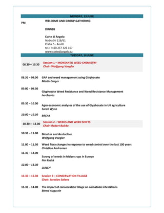 The document outlines the agenda for the Monsanto Weed Workshop "NORTH" taking place from June 13-15, 2011 in Prague, Czech Republic. The workshop will include sessions on Monsanto weed chemistry, weeds and weed shifts, conservation tillage, and weed management systems. Participants will discuss topics like glyphosate resistance, weed control methods in maize crops, and the impact of reduced tillage practices. A field visit is also planned to view Roundup Ready maize crops and tillage practices.