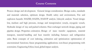 - The course code, credit hours, instructor contact details, and course contents which include topics like process design, hazard analysis, equipment design, and cost analysis.