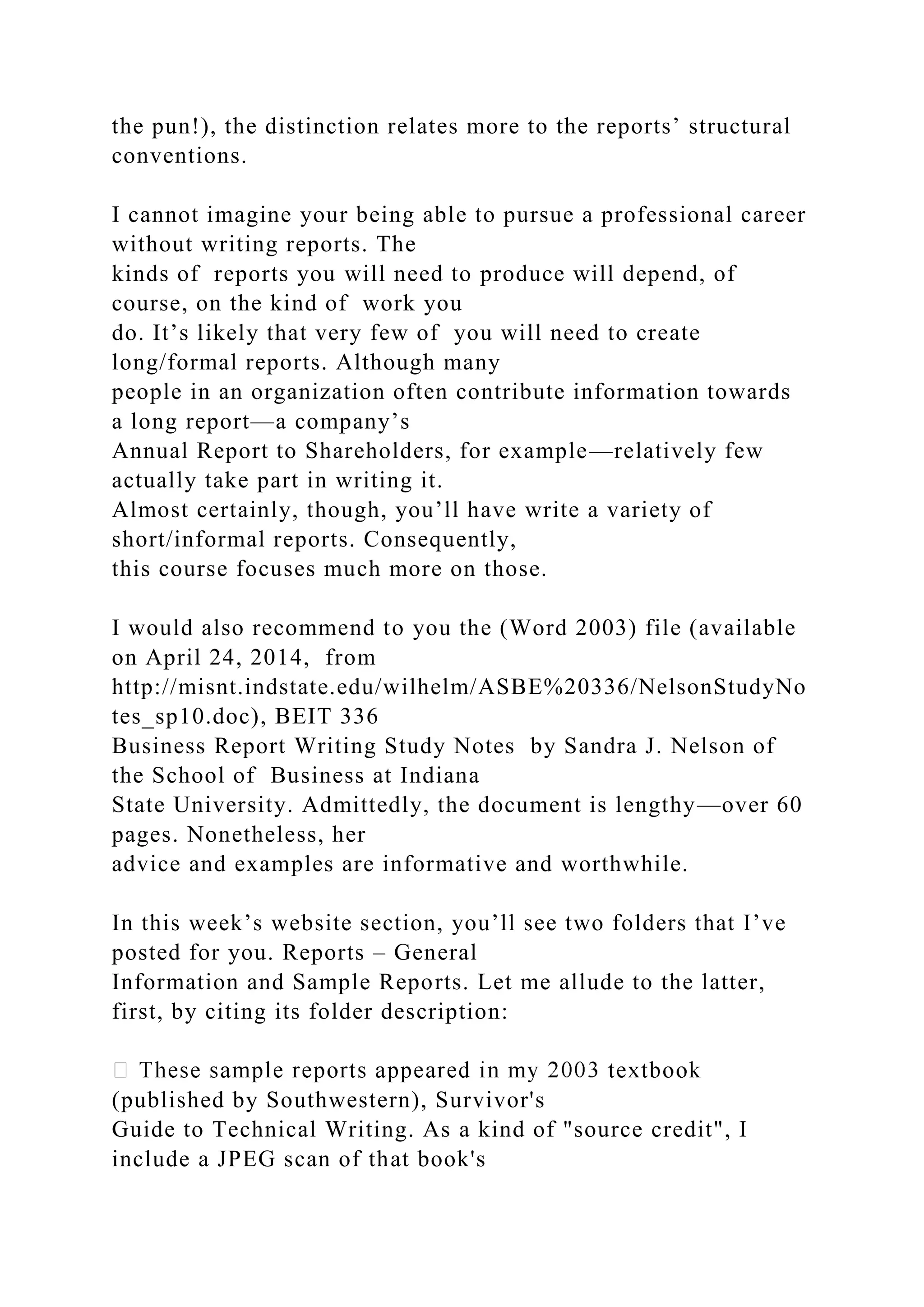 This document is a summary and instructions for a week 5 posting in a communication course, focusing on the importance of report writing and its various formats. It emphasizes the necessity of tailoring reports for specific audiences and distinguishes between informative and evaluative content. Several resources and guidelines for writing effective reports are provided, alongside reminders about deadlines for assignments.