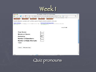 The document discusses the activities and goals for an English class during the first week. It describes exercises done to improve listening and speaking skills, including a story comprehension activity. The student aims to practice all areas of English, especially listening and speaking, as those are the most challenging. The exercises and computer programs in the class are meant to help students improve their English abilities.