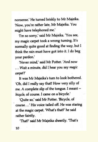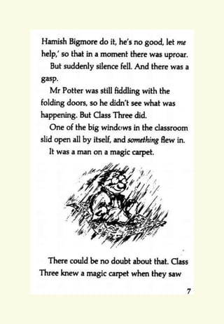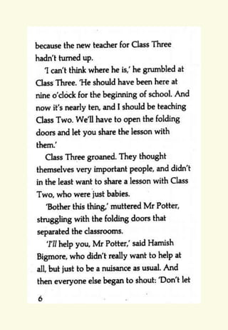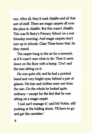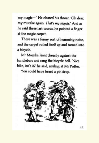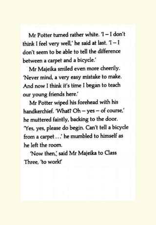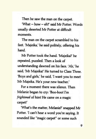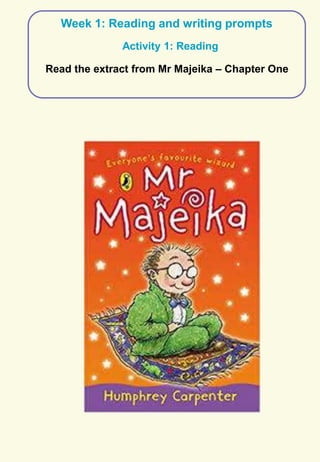 The document provides reading and writing prompts for students based on Chapter 1 of the book "Mr Majeika" by Humphrey Carpenter. It includes 5 activities: 1) reading comprehension questions about characters and the most important character after reading an excerpt, 2) a two paragraph writing prompt about imagining being a student on the day Mr. Majeika arrives as their new teacher, 3) grammar and spelling exercises, 4) practicing spelling words and writing definitions/sentences, and 5) practicing handwriting the spelling words neatly. Students are encouraged to complete the activities and email any work to their teachers.