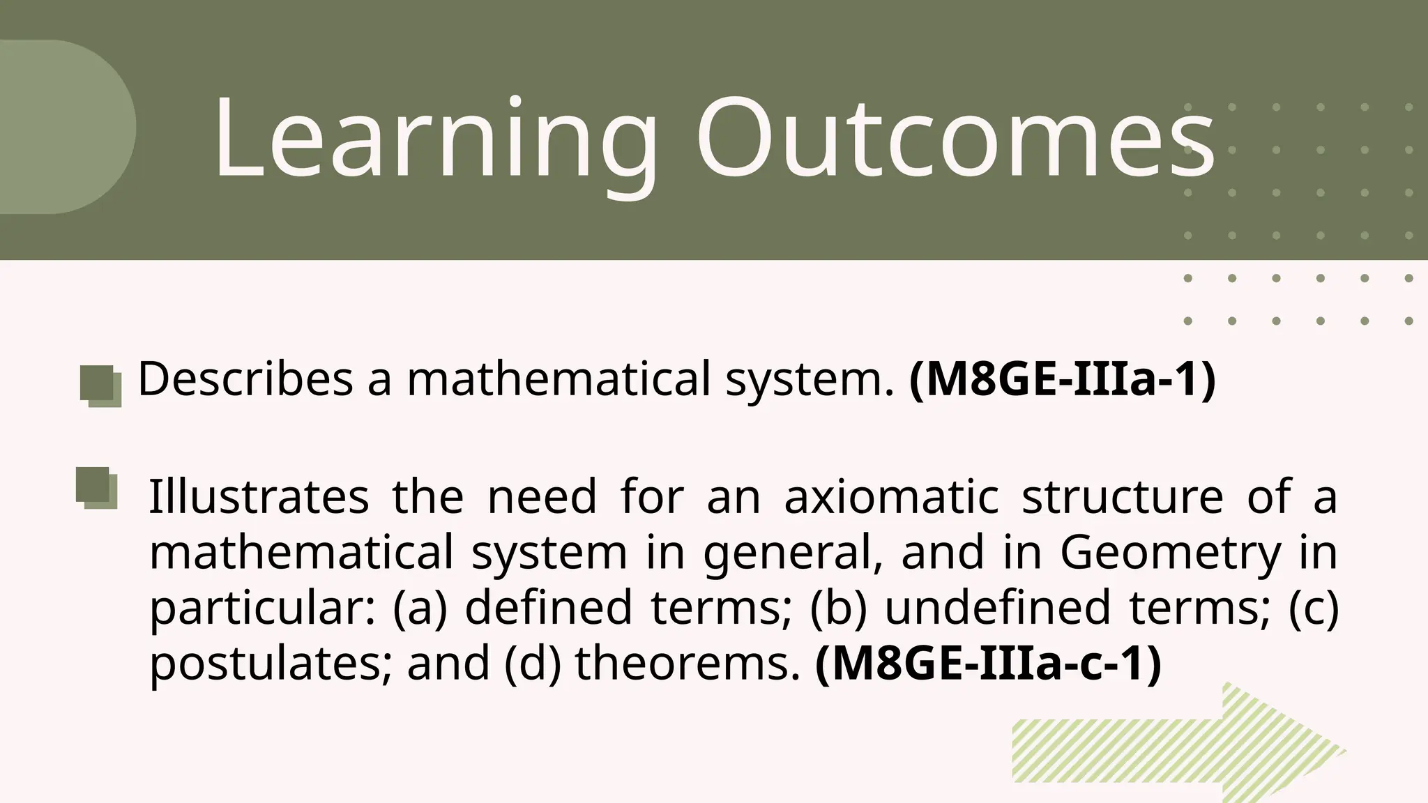 The document outlines the foundational concepts of geometry as a mathematical system, emphasizing the importance of axioms, undefined and defined terms, and theorems. It discusses key geometric elements, including points, lines, segments, and planes, while introducing concepts like collinearity, coplanarity, and the properties of geometric figures. Additionally, it details various postulates that govern geometric relationships and the deductive reasoning process used in geometry.