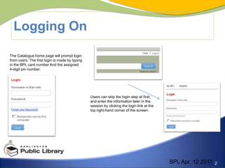 Users must log in with their library card number and PIN to access full features of the catalog like commenting or tagging. They can initially skip login but may be prompted if trying certain restricted actions. When registering, a username can include letters and numbers up to 24 characters long, and an email is optional. The account settings page allows customizing the username, email, preferred pickup locations, and changing the PIN number. Help is available through context-specific help buttons and a FAQ page.