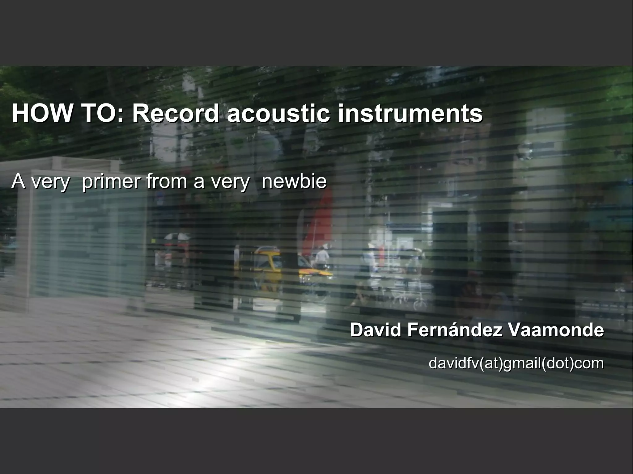 This document provides guidance on how to record acoustic instruments. It discusses the differences between recording electric and acoustic instruments and notes that acoustic instruments require capturing air pressure variations rather than voltage. Basic considerations for recording include understanding the instrument's behavior, frequency range, and sound emission location. Microphone choice depends on the frequency response and polar pattern needed. Placement involves testing different locations to find where the microphone captures the best sound based on the instrument and room acoustics.