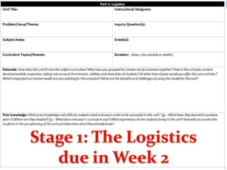 This document outlines a template for planning quality instructional design. It includes 4 stages: 1) Desired results which identifies learning targets, essential questions, and knowledge/skills students will develop. 2) Assessment evidence which includes formative and summative assessments. 3) Learning plan which details learning activities and strategies. 4) Accommodations and differentiation for students. The document emphasizes the importance of beginning instructional planning with the end in mind by determining learning goals and appropriate assessments of student understanding.