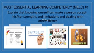 The document discusses knowing oneself during adolescence. It explains that understanding one's strengths, weaknesses, abilities, and interests can help adolescents accept themselves and relate better to others. The document also outlines key physical, cognitive, and psychosocial changes that occur during early and mid-adolescence, such as sexual maturation, advanced reasoning skills, and stronger peer relationships.
