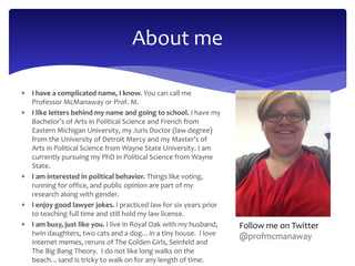 Professor McManaway teaches POL 120, an introductory course on American national government and politics. The course is entirely online, using Blackboard and email for communication. Students will learn from textbook readings, supplemental readings, and PowerPoint presentations with audio. Participation through weekly discussion boards is required. Students must complete exams, analytical essays, a civic engagement assignment, and a position paper on a current political issue. The professor emphasizes respect and is available to help students through various means of communication.
