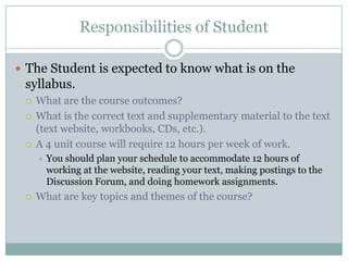 The document outlines the responsibilities and expectations for online students at Stanbridge College. It states that students are expected to be familiar with the syllabus and spend 12 hours per week on coursework for a 4-unit class. Students must make 2-6 discussion forum posts per week, and will be dismissed if they do not post for 14 consecutive days. Instructors must respond to student queries within 48 hours and grade assignments within 5 days. They are also available for 2 hours of office hours per week and will refer struggling students to a tutor.