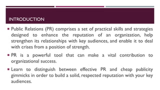Public relations (PR) is essential for enhancing an organization's reputation and fostering strong relationships with key audiences, while effectively navigating crises. The aim of PR is to cultivate understanding and support through planned activities, contrasting with deceptive publicity tactics. Integrating PR into the marketing mix as a tool for building perception can significantly contribute to achieving marketing objectives and improving organizational communication.