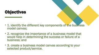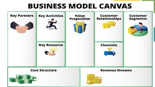 The document outlines key components of the business model canvas, emphasizing its importance in determining business success. It details nine components essential for creating a business model, including key partners, activities, resources, value propositions, and revenue streams. The emphasis is on the necessity of having a structured business model in a competitive market to effectively engage with customers and generate value.