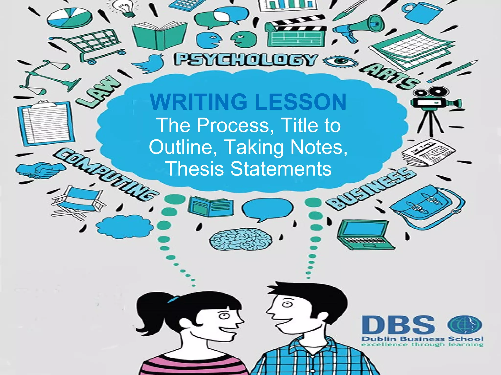 This document provides guidance on the academic writing process. It discusses understanding the essay requirements, selecting relevant sources, taking notes, outlining, and writing drafts. Key steps include comprehending the title, choosing suitable source material, paraphrasing and summarizing notes, combining sources, and creating a structure outline. Note-making is presented as an important skill that leads to clear essays. Different terms in essay titles signal analyzing, describing, examining, stating, suggesting, or summarizing. Outlines are emphasized as a way to structure essays and ensure the question is answered.