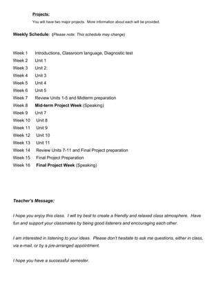 This document provides the syllabus for a Freshmen English course at Soongsil University in Spring 2012. It outlines the instructor, required textbooks, course objectives of improving English skills through interaction and activities, and how students will build confidence communicating in English and gain cultural perspectives. Students will be evaluated based on attendance, participation including homework and in-class performance, midterm and final projects, writing quizzes, and a final writing test. The attendance policy and participation expectations are also summarized. A weekly schedule outlines the units to be covered throughout the semester.
