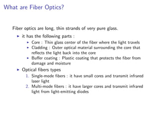 Fiber optics use thin strands of glass to transmit light signals for communication. They have a core that carries the light and a cladding that reflects the light down the core. There are two types of fibers - single-mode for infrared laser light and multi-mode for infrared LED light. Light travels through total internal reflection down the core due to the cladding not absorbing any light. Fiber optic systems have transmitters that encode light signals, fibers that conduct them, and receivers that decode the signals. Fiber optics offer advantages like lower costs, higher bandwidth, lighter weight, and flexibility compared to copper cables.
