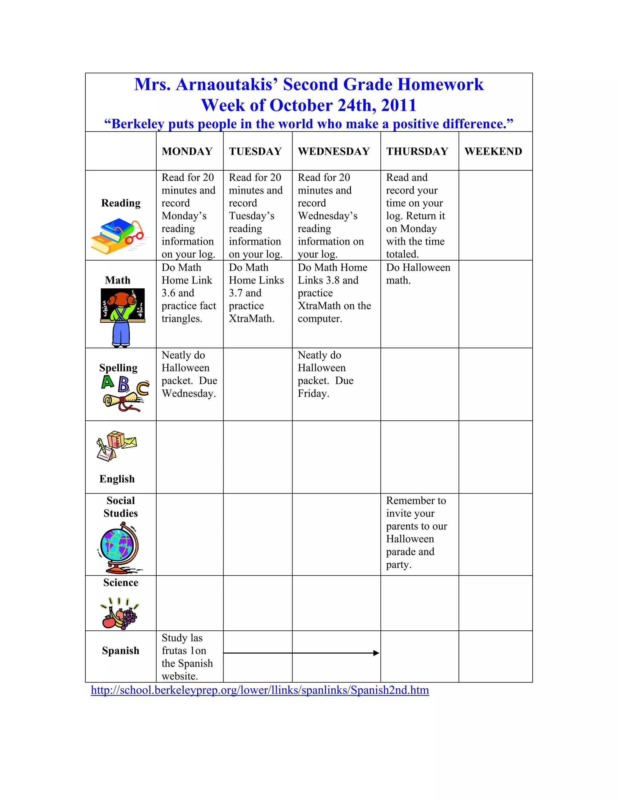 Mrs. Arnaoutakis' Second Grade homework assignments for the week of October 24th focused on reading, math, spelling, and Spanish. Students were asked to read for 20 minutes each night and log their reading times. Math assignments included completing homework links on fractions and practicing math facts. A Halloween spelling packet was assigned and due on Wednesday and Friday. Students were also reminded to invite parents to the upcoming Halloween parade and party.