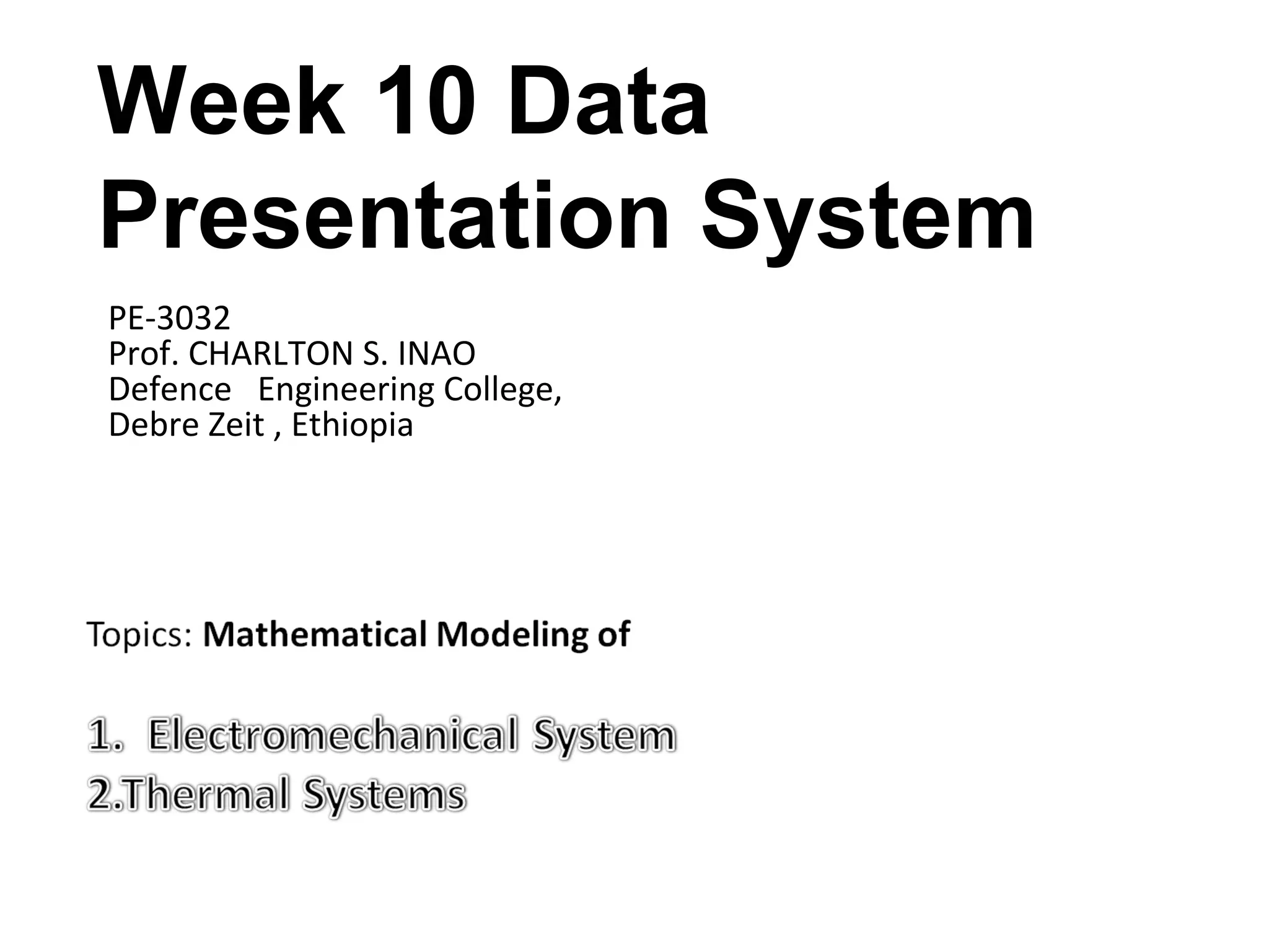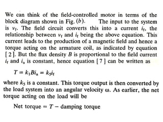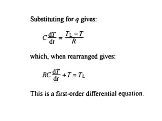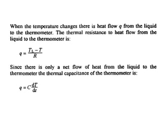 This document discusses electromechanical systems and their transfer functions. It provides examples of control systems using electromechanical components like a NASA robot arm. It also covers modeling of thermal systems, the three modes of heat transfer (conduction, convection and radiation), thermal resistance, thermal capacitance, and provides examples applying these concepts.