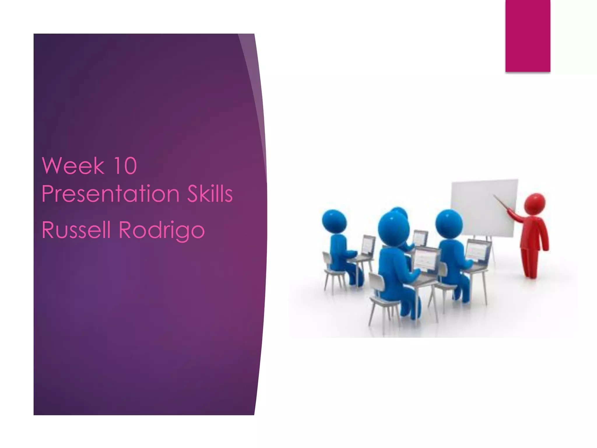 This document provides guidance on developing effective presentation skills. It discusses understanding the purpose of a presentation, identifying general skills like appearance, eye contact and body language. It also covers using visual aids effectively, with rules like keeping text minimal. The document emphasizes the importance of preparation, including outlining the presentation and practicing to manage nerves. It also offers tips for getting the audience's attention, using signposting, and concluding while handling questions.