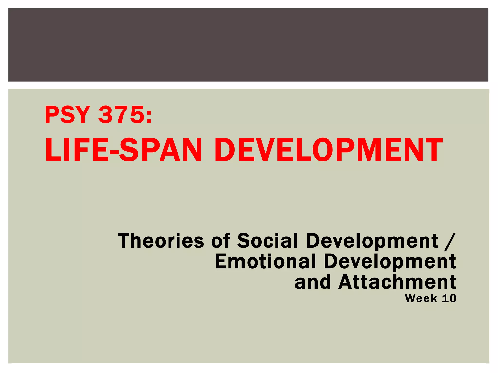 This document discusses theories and research on social and emotional development across the lifespan. It covers topics like attachment theory, temperament, emotional development from infancy through adulthood, and the role of caregivers and environment in shaping development. Key findings include that secure attachment in infancy is important for later functioning, temperament is influenced by both biology and experience, and emotional regulation abilities increase with age.