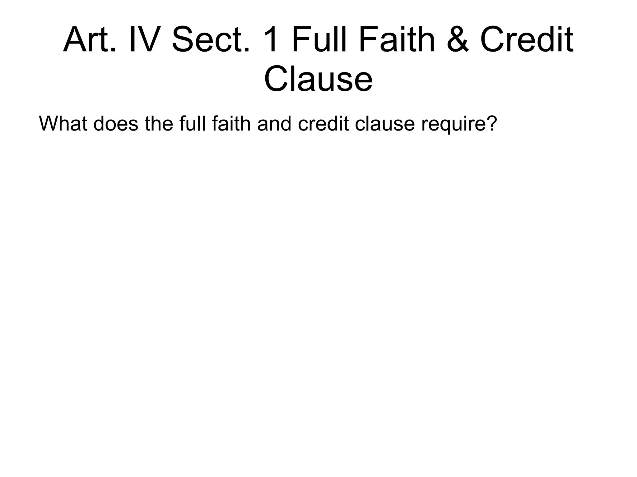 - The full faith and credit clause requires states to respect other states' laws, records, and judicial rulings, though not things like gambling laws. Homosexual marriage is currently challenging this clause.