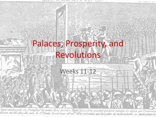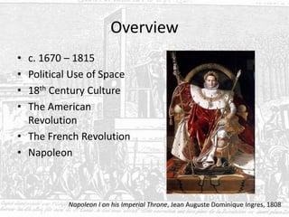 This document provides an overview of political and cultural developments in Europe and the Americas between the late 17th and early 19th centuries. It discusses the rise of absolutism and the construction of grand palaces like Versailles to consolidate royal power. It then covers the prosperity of the 18th century led by trade, the ideas of the Enlightenment, and the American and French Revolutions that overthrew the old monarchical order. The document concludes with a discussion of Napoleon's rule in France and the spread of revolutionary ideals to other parts of the world.