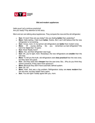 A mother and son discuss old and new refrigerators, comparing their experience with their old refrigerator that lasted over 10 years to their new one that is not working properly. The mother notes that while old refrigerators were larger and cheaper, they lacked modern features like automatic defrosting, but tended to last many years, unlike newer appliances.