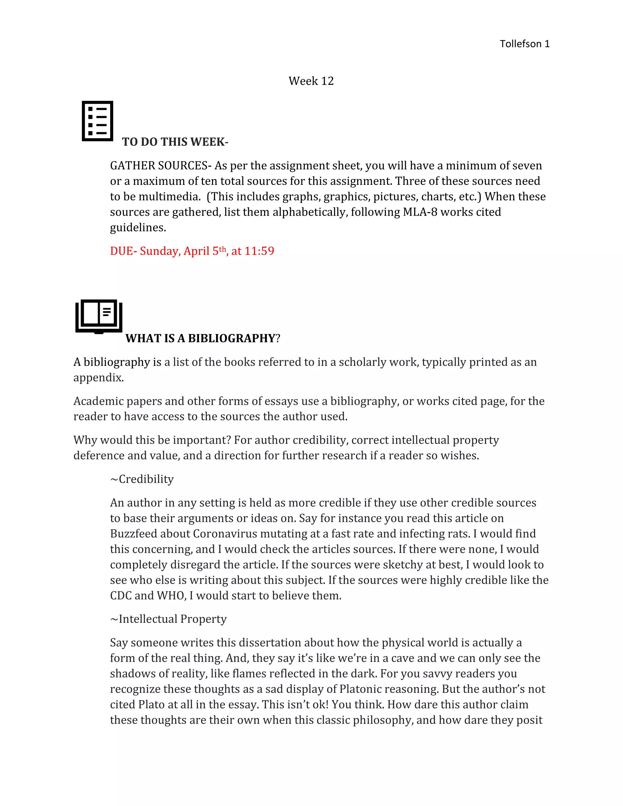 This document provides instructions for an assignment that is due on April 5th. Students are asked to gather between 7-10 total sources on their topic, including a minimum of 3 multimedia sources. The document then provides explanations of what a bibliography is, why citations and bibliographies are important for credibility, acknowledging intellectual property, and enabling further research. It provides examples of correct MLA citation formats and a sample bibliography page for the student to follow.