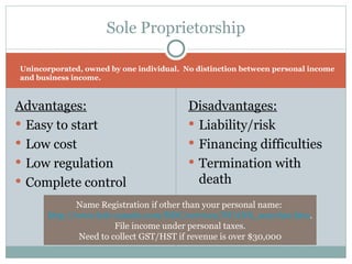 This document discusses different legal forms of businesses including sole proprietorships, partnerships, and corporations. It provides advantages and disadvantages of each structure. It also summarizes the key components of a business plan including an executive summary, business strategy, marketing strategy, operational plan, and financial forecasts. The document notes that financing options for businesses include personal funds, bank financing, government grants, angel investors, and venture capitalists.