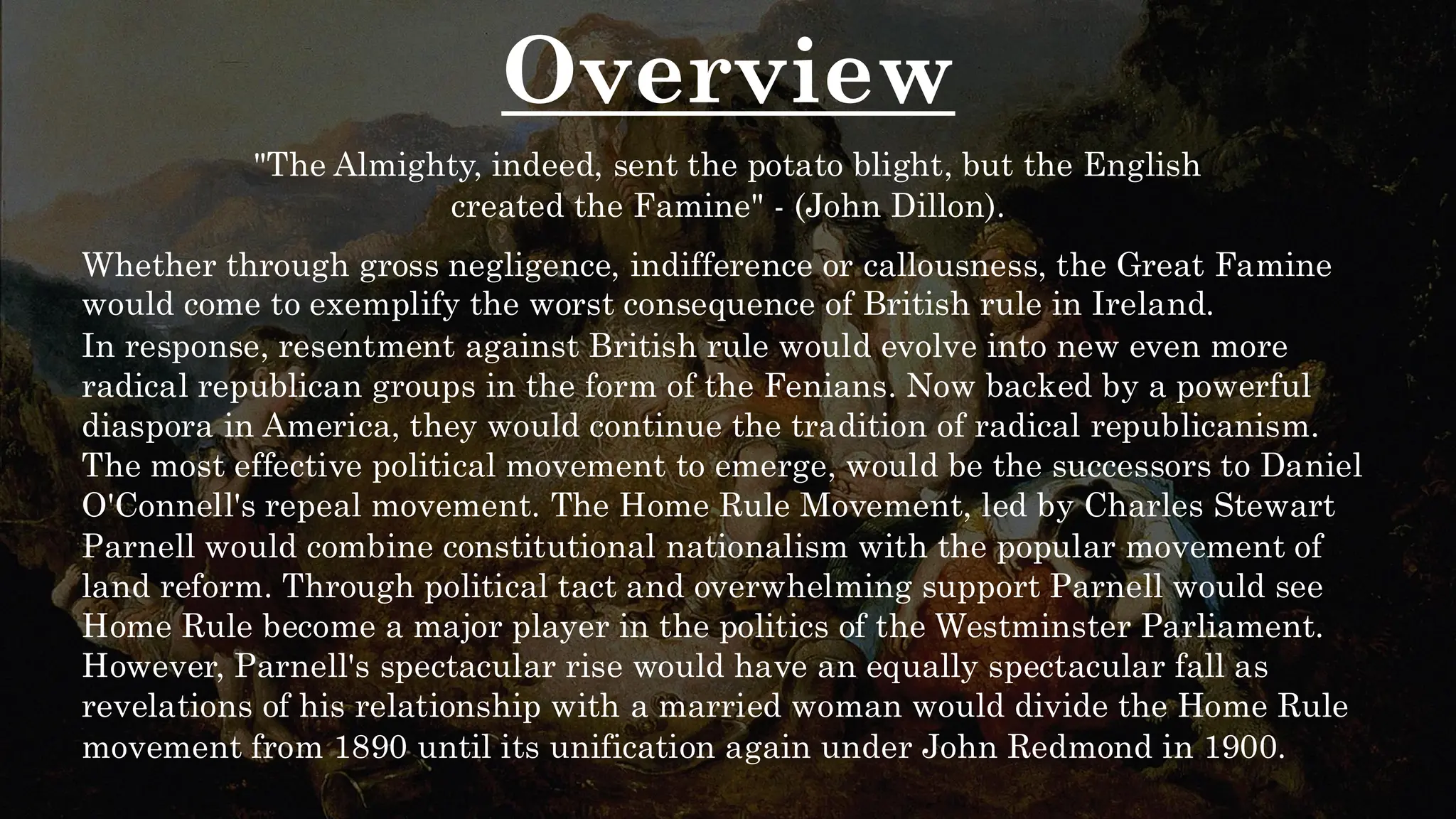 The document outlines the political landscape in 19th century Ireland, focusing on the Great Famine, the rise of radical republican groups such as the Fenians, and the home rule movement led by Charles Stewart Parnell. It details key events and figures, including Parnell's successes and scandals, along with the impact of the Land War and cultural national movements like the Gaelic Revival. Ultimately, it highlights the interplay between constitutional nationalism and revolutionary republicanism in shaping Irish politics leading into the 20th century.