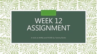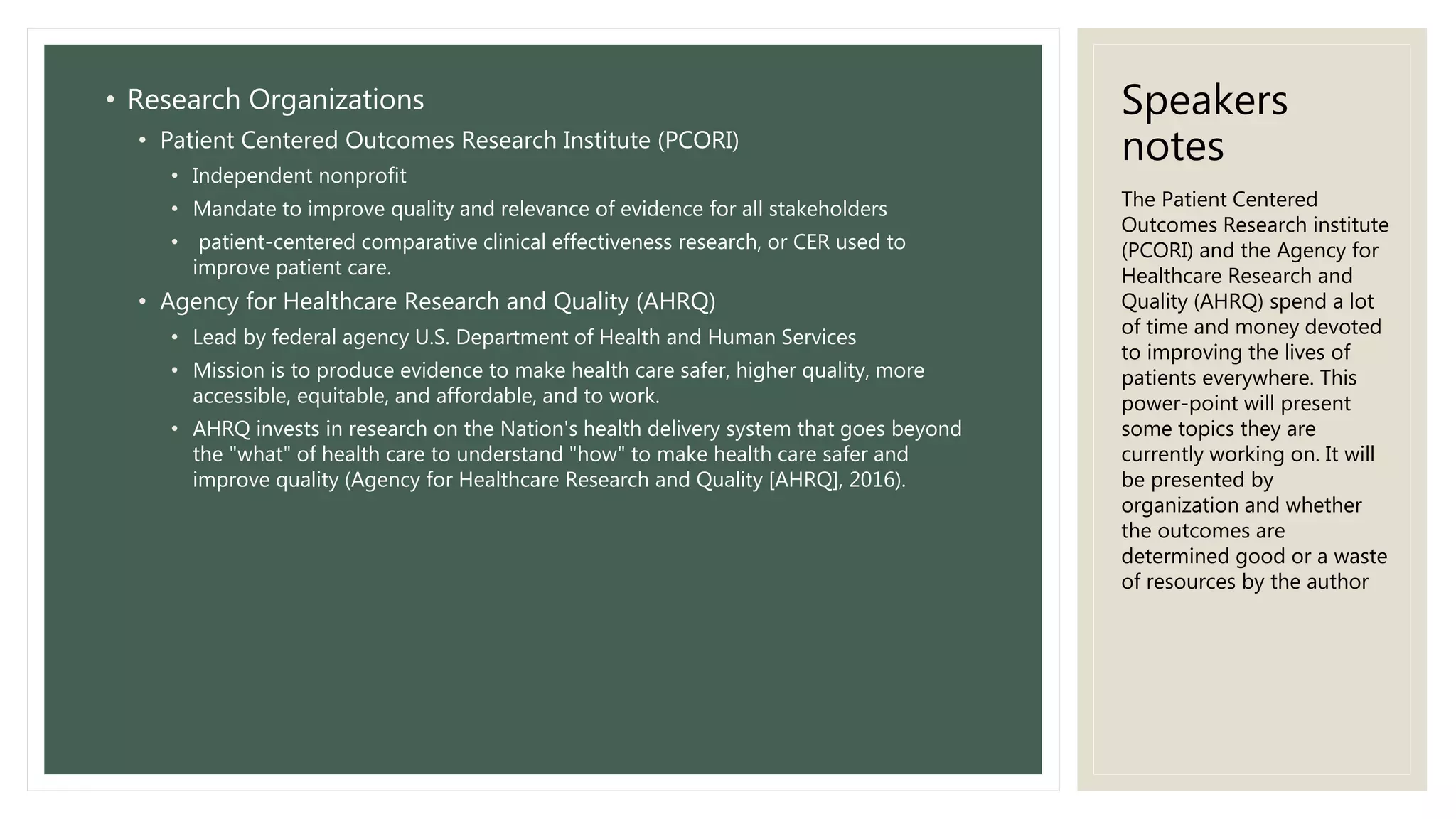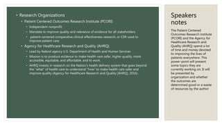 The document discusses two research organizations, the Patient Centered Outcomes Research Institute (PCORI) and the Agency for Healthcare Research and Quality (AHRQ). It summarizes several projects currently being undertaken by each organization, including a study by Memorial Hermann Health Systems using a mobile stroke unit that has shown positive outcomes for rapidly treating stroke patients. Another PCORI project aims to reduce opioid dependency by comparing different risk communication methods, but outcomes have not been reported yet. AHRQ is evaluating chronic disease self-management programs that have led to statistically significant improved self-efficacy. However, the author questions whether another AHRQ project enhancing data collection of patient race and ethnicity will truly illuminate health disparities or just