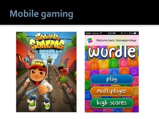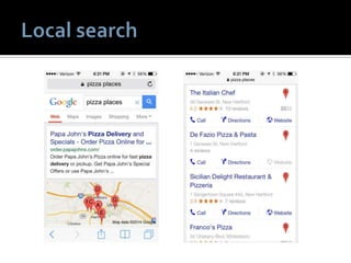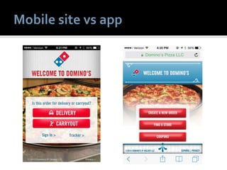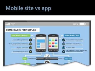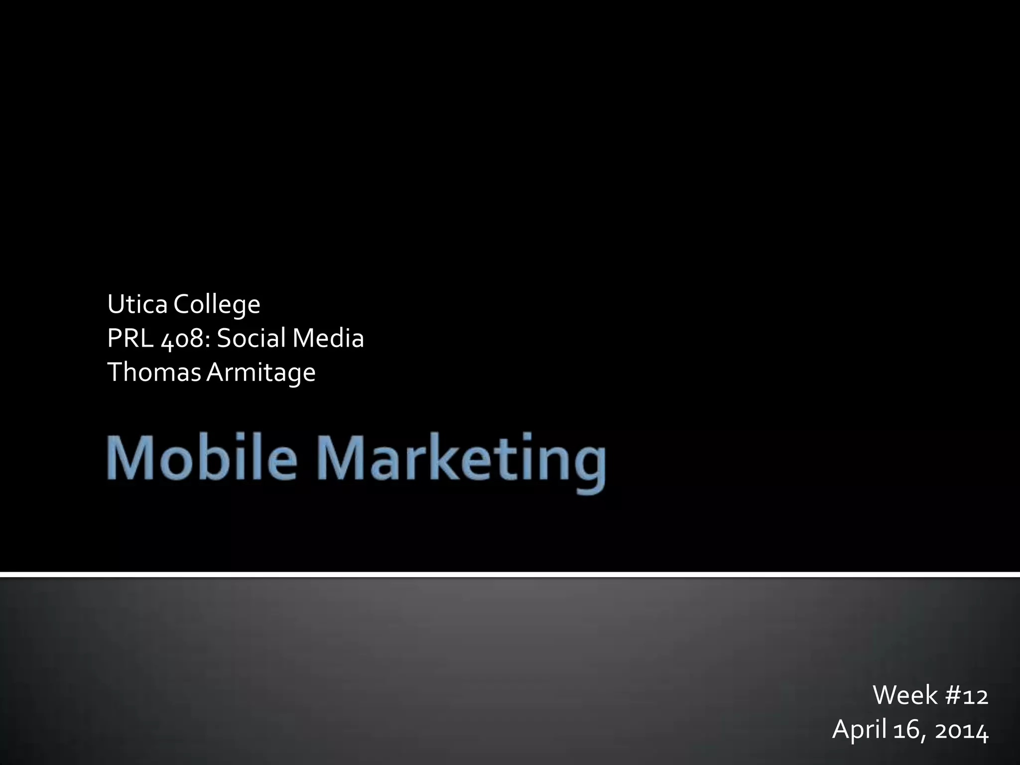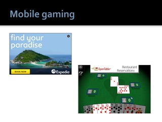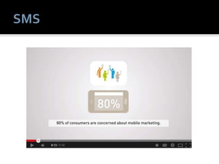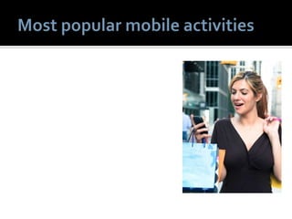 1) The document discusses various topics related to social media and mobile marketing. It provides statistics on the most popular mobile activities such as games, weather and maps/search. It also lists the top mobile apps and platforms used. 2) Location-based services are highlighted as an important part of mobile marketing. Examples of location-based tactics include location-enabled mobile ads and local search features. 3) The document provides recommendations for effective mobile marketing, such as optimizing campaigns for local audiences and experimenting with different strategies.