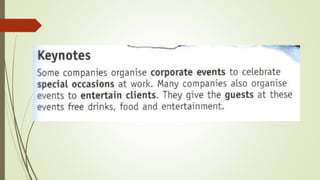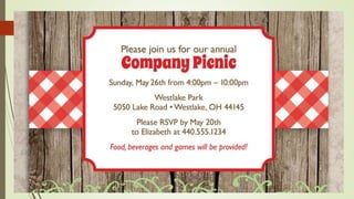 The document discusses various company events from the author's job, including a company picnic. It provides context for the meaning of R.S.V.P. in response to invitations and the etiquette of replying promptly. It also notes the difference between using "I would like to" versus "I like" in phrases. Finally, it asks questions about dreams.
