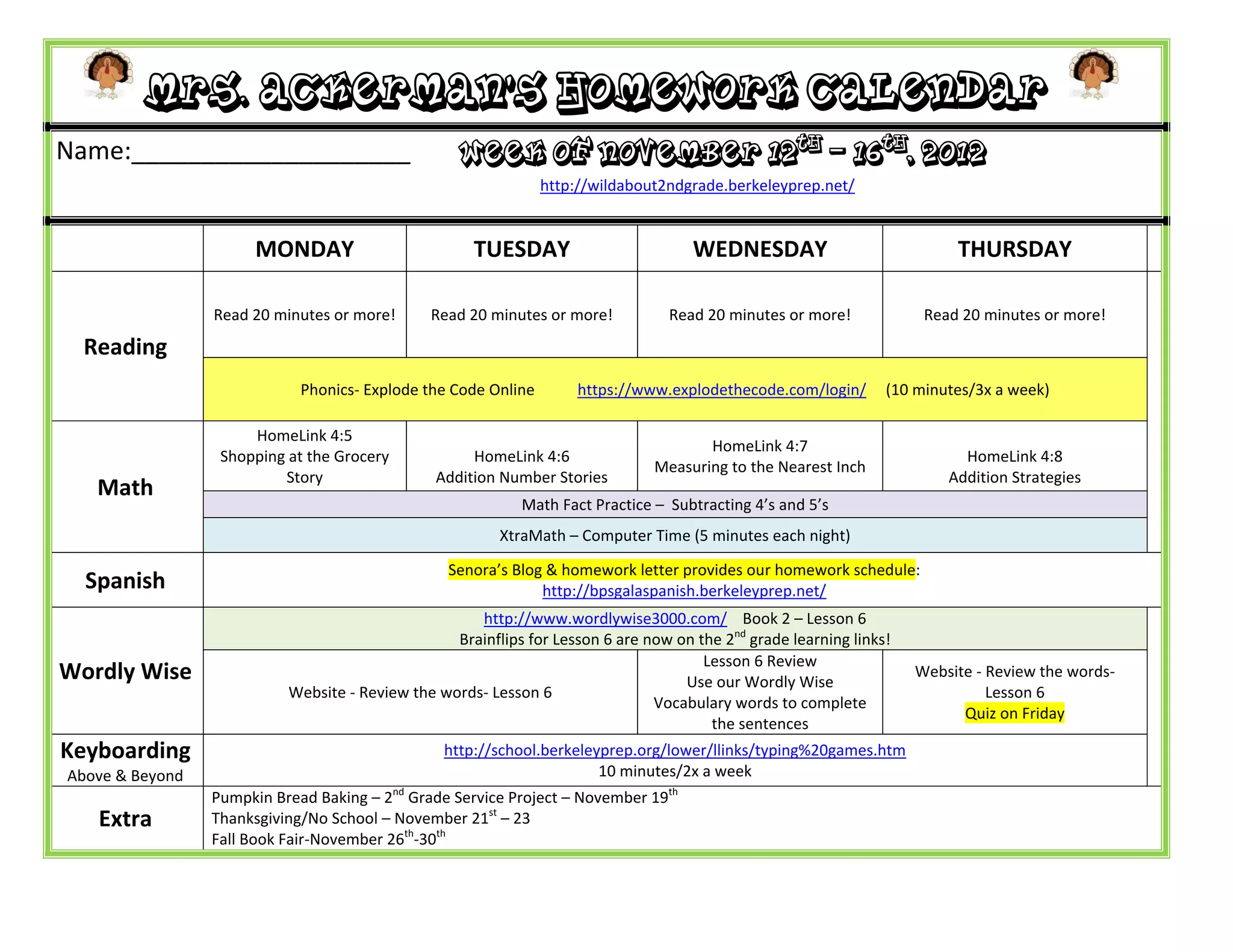 This document is Mrs. Ackerman's homework calendar for her second grade class for the week of November 12th-16th, 2012. It includes assignments for each subject each day including reading 20 minutes per day, phonics and reading assignments, math assignments involving number stories, measurement, and math fact practice, Spanish lessons from Senora's blog, Wordly Wise vocabulary lessons and website reviews, keyboarding practice, a second grade service project to bake pumpkin bread, and upcoming events like Thanksgiving break and a book fair.