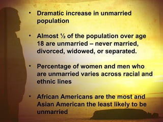 Dr. Chris Bowen of Beulah Heights University presented on the dramatic increase in the unmarried population in the United States. Nearly half of adults over 18 are unmarried due to factors like delayed marriage, increased educational and economic opportunities for women, higher divorce rates, more liberal attitudes, and uneven ratios of unmarried men to women. Cohabitation is also on the rise due to a more liberal social climate, changed views of marriage and relationships, and women's financial independence. Cohabitation is most common among African Americans, Hispanics, those with less education, from divorced families, who are less religious, and favor egalitarian gender roles. Reasons for cohabitation include serving as a substitute for marriage,