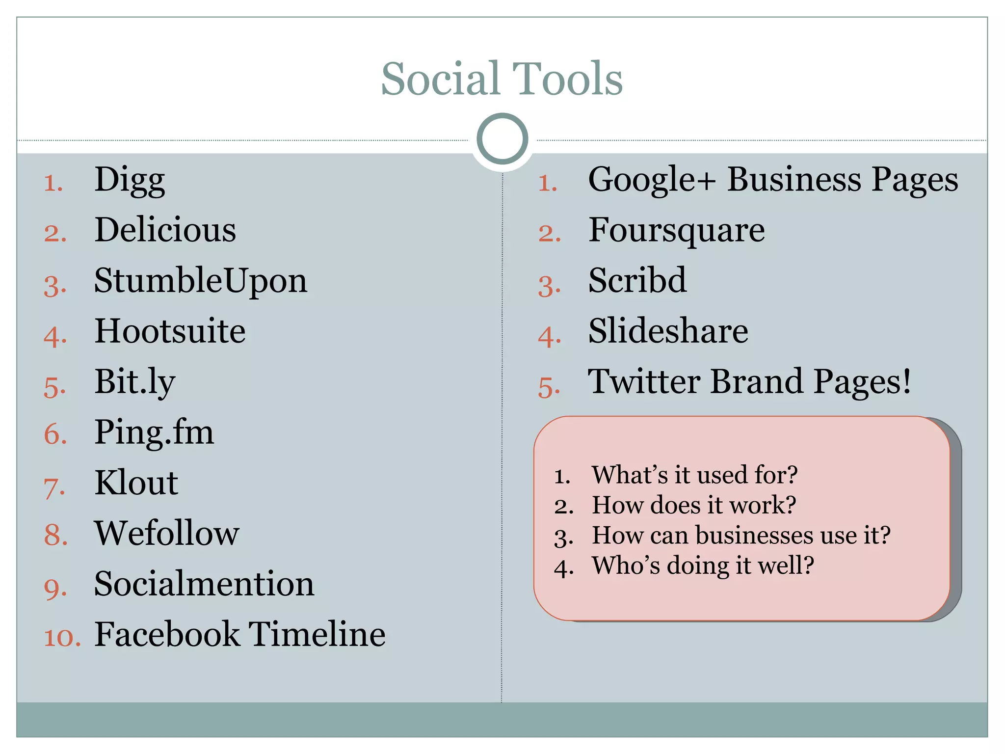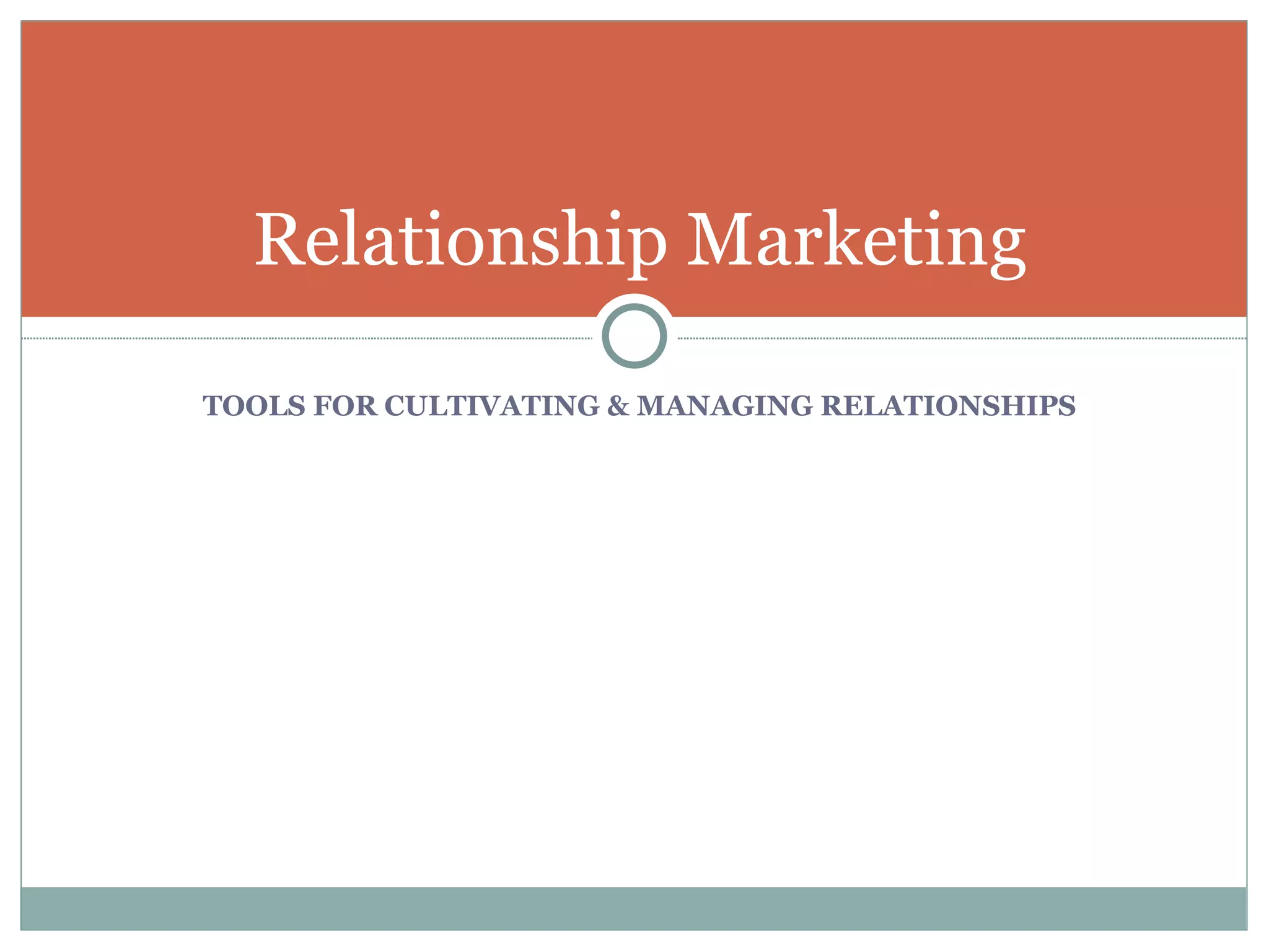 The document discusses various social media tools and how businesses can use them to build and manage customer relationships. It provides statistics about the importance of customer retention and positive experiences. It also discusses concepts like customer relationship management, gathering customer feedback, loyalty programs, networking, and using relationships to differentiate a brand. Specific tools mentioned include Facebook, Twitter, LinkedIn, Foursquare, and others.