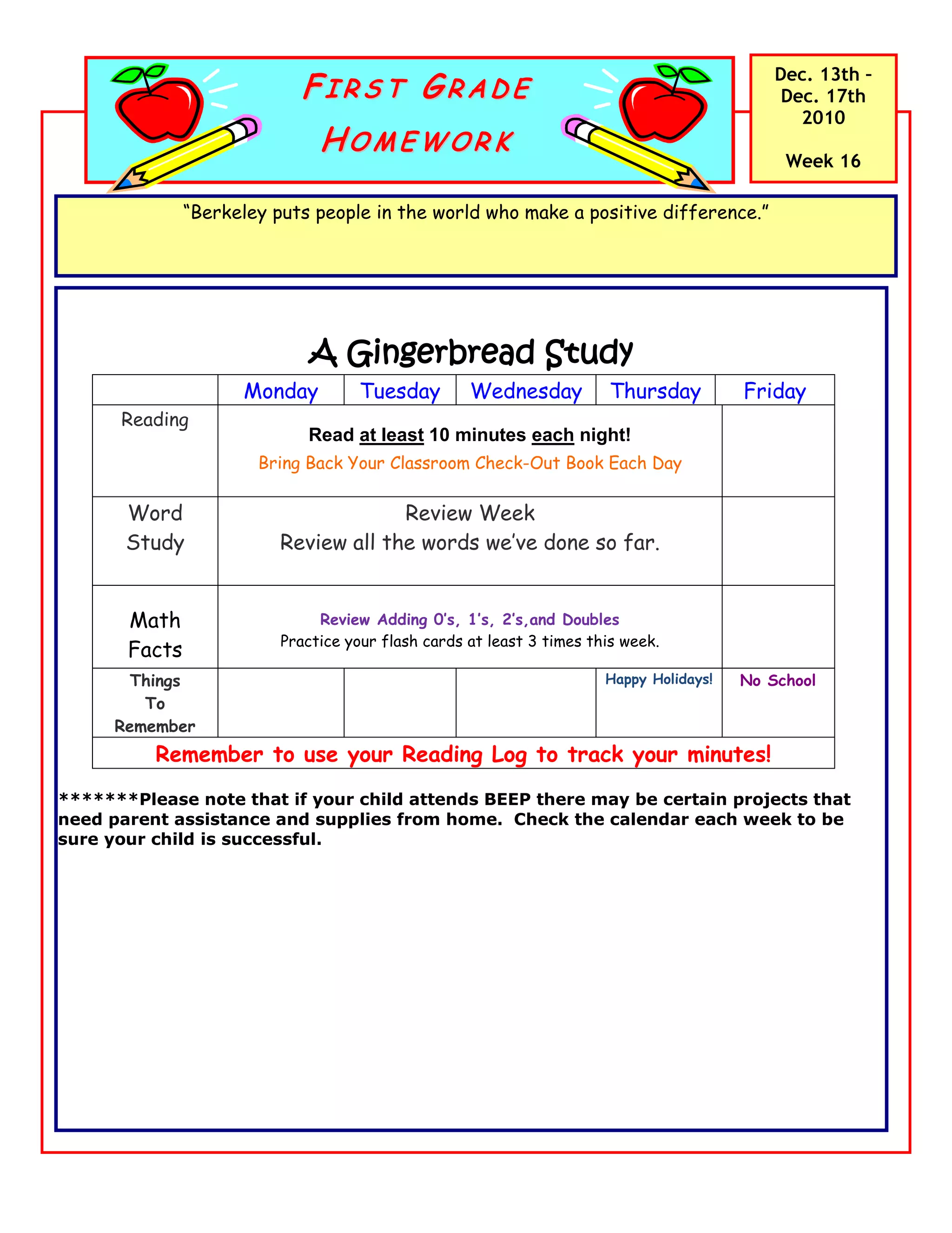 This homework assignment is for the week of December 13-17, 2010 for a first grade class. It includes reading for at least 10 minutes per night, returning the classroom reading book each day, reviewing word study and math facts covered so far, and practicing flash cards 3 times. It reminds parents to use the reading log and check the calendar for any BEEP projects needing supplies or assistance.