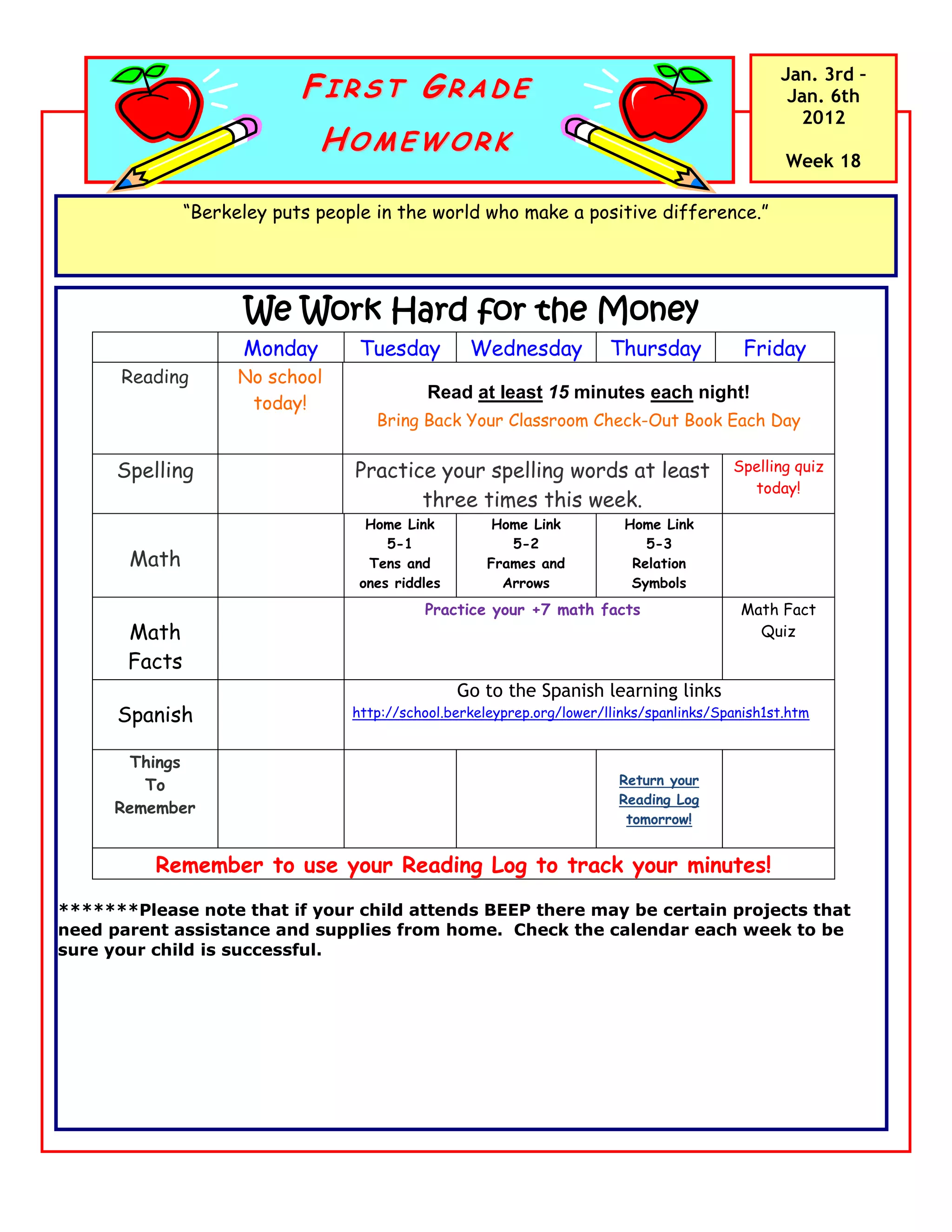 This homework assignment sheet outlines the schedule and assignments for a first grade student from January 3rd to 6th, 2012. Key assignments include reading for at least 15 minutes each night, practicing spelling words 3 times during the week, and practicing addition facts up to 7 for math. It also notes an upcoming spelling quiz on Friday and math fact quiz. The document reminds parents to have their child track reading minutes and check the weekly calendar for any projects requiring home supplies through the school's before/after care program.