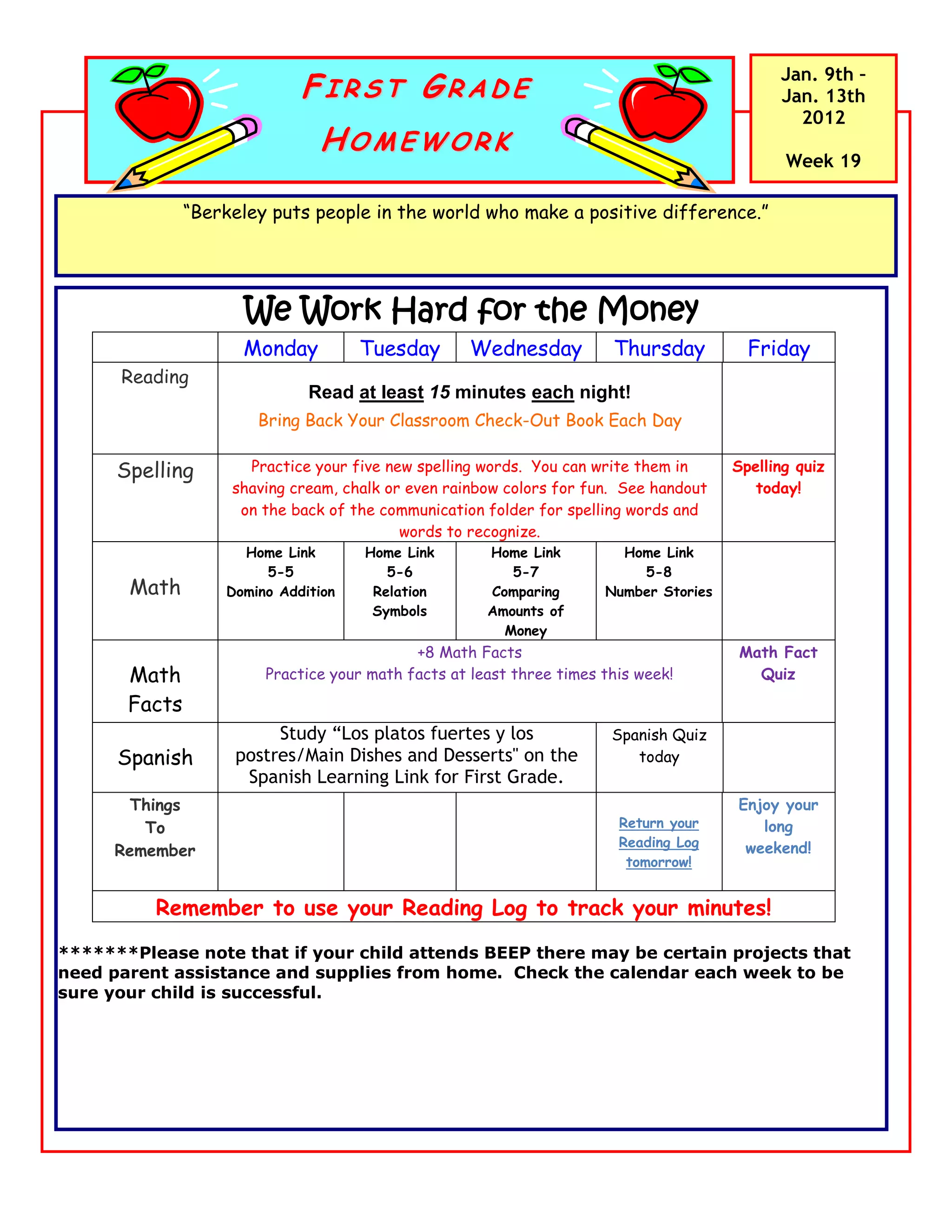 This homework assignment outlines the school work for first grade students from January 9th through January 13th, 2012. It includes daily assignments for reading, spelling, math, Spanish, and math facts. Students are asked to read for at least 15 minutes each night, practice their spelling words, complete math homework sheets, study Spanish vocabulary, and practice math facts. A spelling quiz, Spanish quiz, and math fact quiz are scheduled for the week.